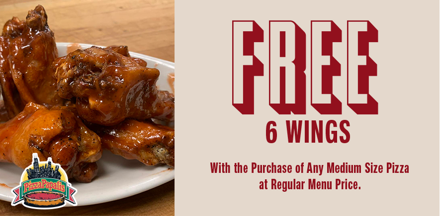 Good only atFREE 6 Wings W/Purchase of Any Medium Size Pizza at (Reg. Menu Price)